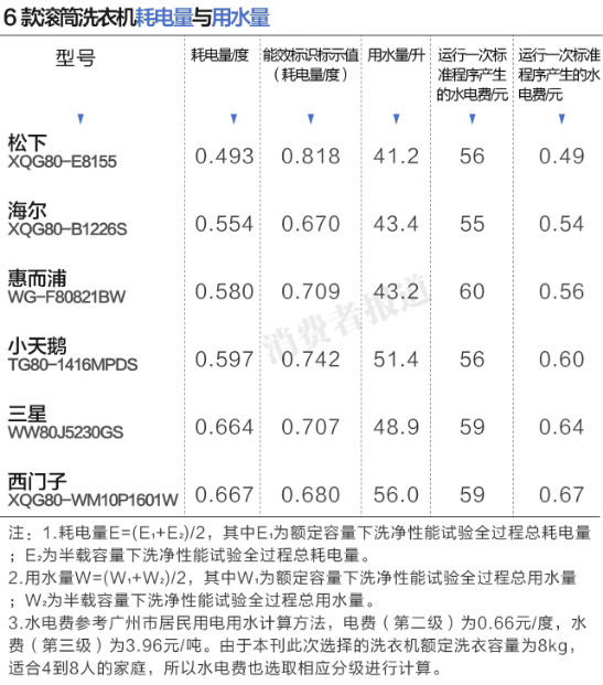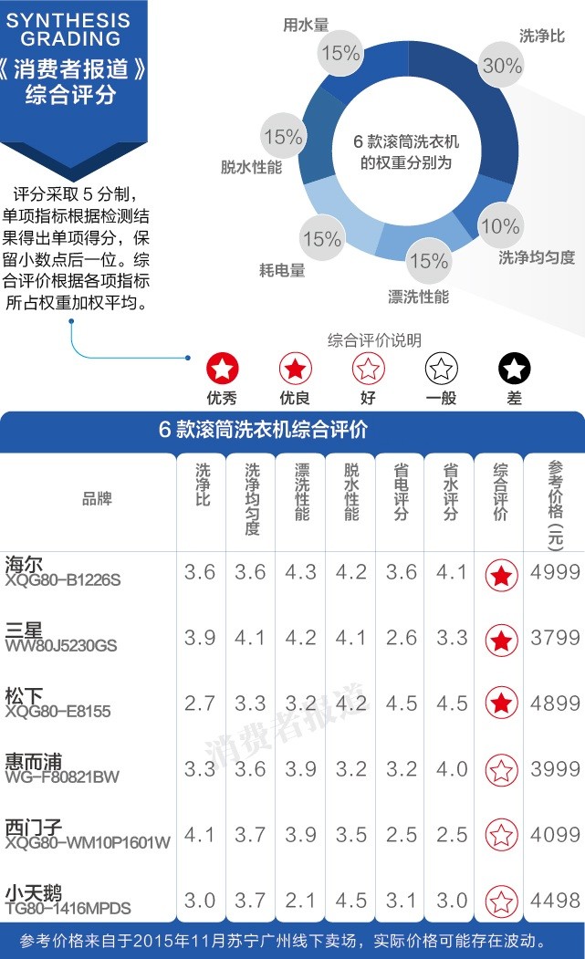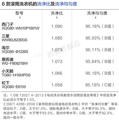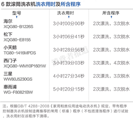 2015年11月,《消費者報道》向第三方權威檢測機構送檢了海爾、小天鵝、松下、惠而浦、三星及西門子這6個品牌的滾筒洗衣機,就洗凈效果、漂洗效果、脫水效果及耗能情況4個方面展開對比測試。