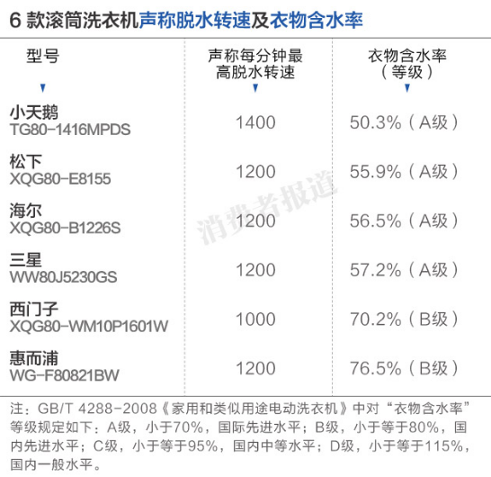 本次測試中,小天鵝、松下、海爾及三星的脫水性能都達到了A級,其中聲稱每分鐘最高脫水轉速(下稱脫水轉速)達到1400轉的小天鵝表現最好,脫水后的衣物含水率僅為50.3%;而西門子與惠而浦的脫水性能僅為B級。