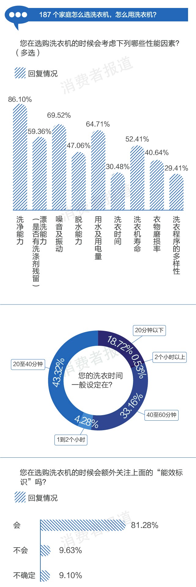 結果顯示:86.1%的讀者最關心洗凈能力,其次是噪音及振動和用水用電量。76.48%的讀者洗衣時間為20到60分鐘。81.28%的讀者選購時會關注“能效標識”。