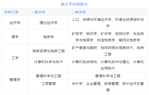 專業學位授權點:工商管理(MBA)、地質工程、會計(MPACC)、金融