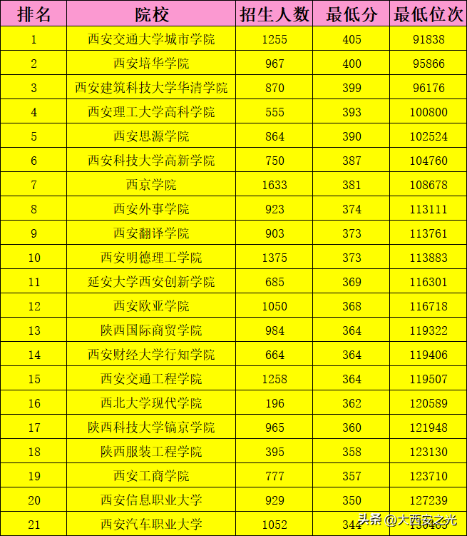 原獨立學院及民辦院校劃入二本招生,但分數線明顯低于公辦。分數線最高的西安交通大學城市學院低了商洛學院(公辦最低)11分!西安培華學院居然超過建大華清學院。交大城市學院和建大華清在全國都算很不錯的三本,外省很多獨立學院轉公辦了,陜西好像還沒有一所?不知是不是因為本地高校多,財政無力負擔。西安明德理工學院(原西工大的獨立學院)改名后沒了西工大金字招牌,排名跌了不少!
