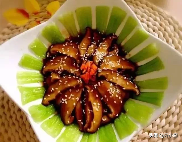 11、做好的象征吉星高照寓意的七個香菇擺在有油菜上,再澆上湯汁,亮麗登場!