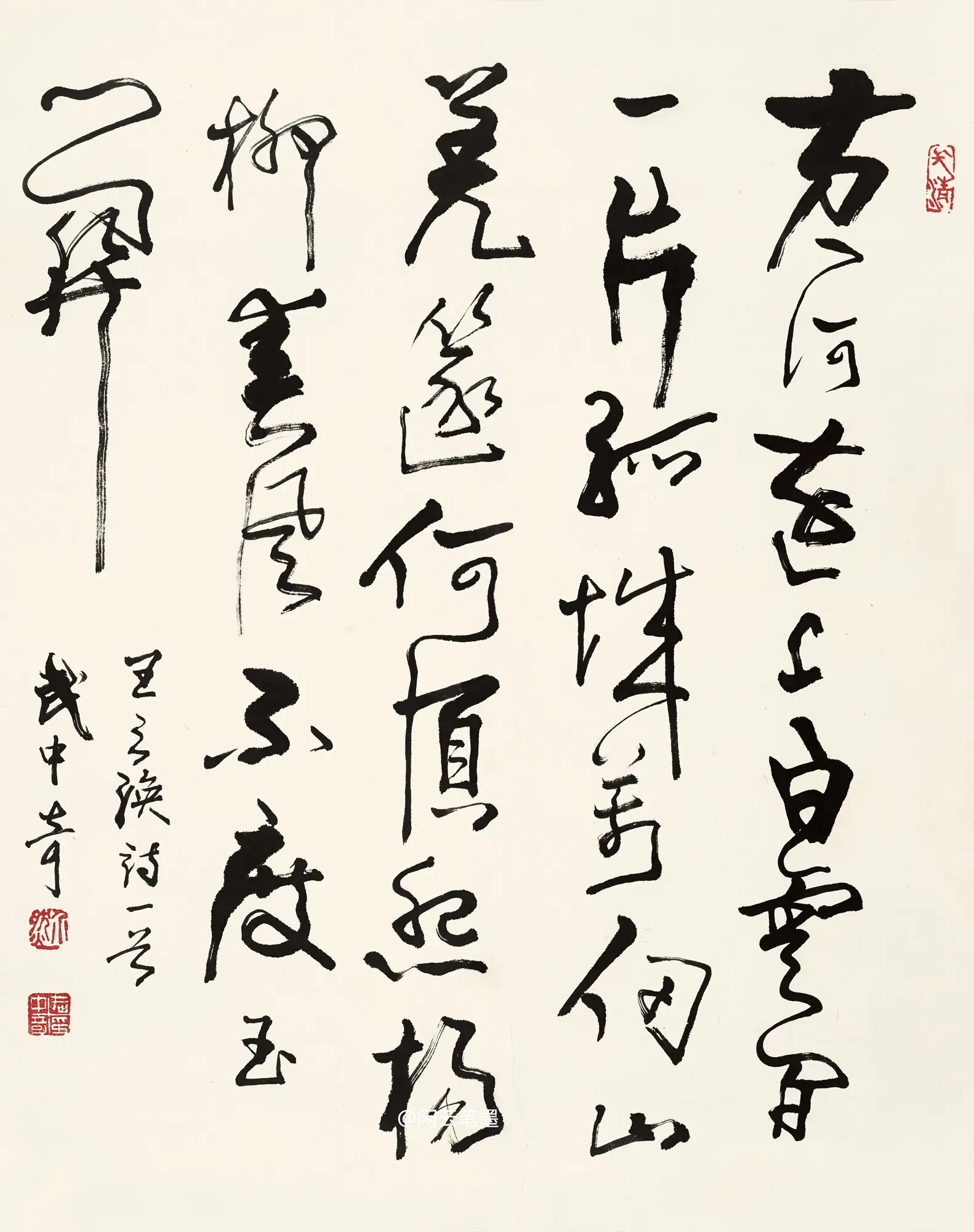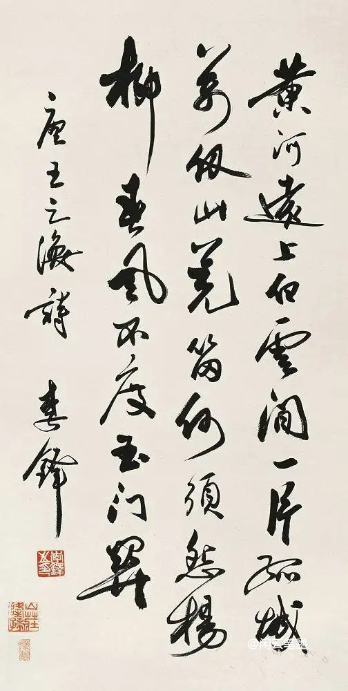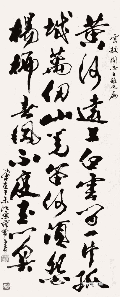 范曾的這幅字用筆沉雄有力,線條粗獷豪放、力感十足,整體上看視覺效果震撼,氣勢威武。