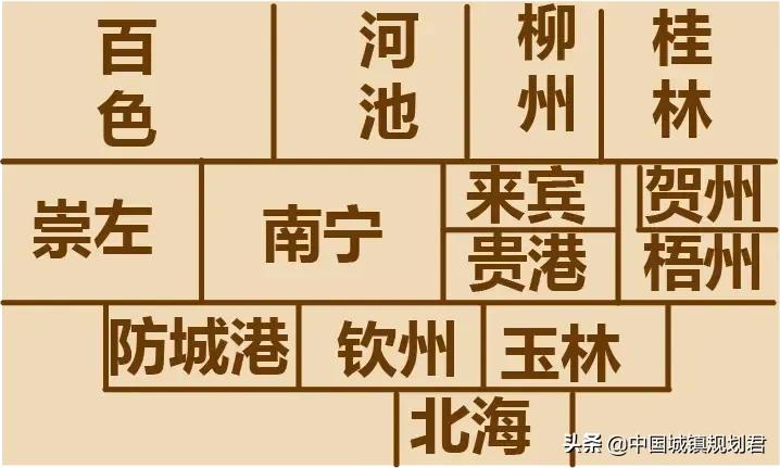 第九張極簡地圖是廣西自治區地圖。從圖上看,來賓市、貴港市和南寧市位于自治區的中心,柳州市是北部中心城市,北海市是南部中心城市,且北海市與欽州市及防城港市的北部灣區域應該合并一座地級市,爭取升格為副省級的國家計劃單列市,從而形成廣西自治區的三大中心城市(南寧市、柳州市、北部灣市)。