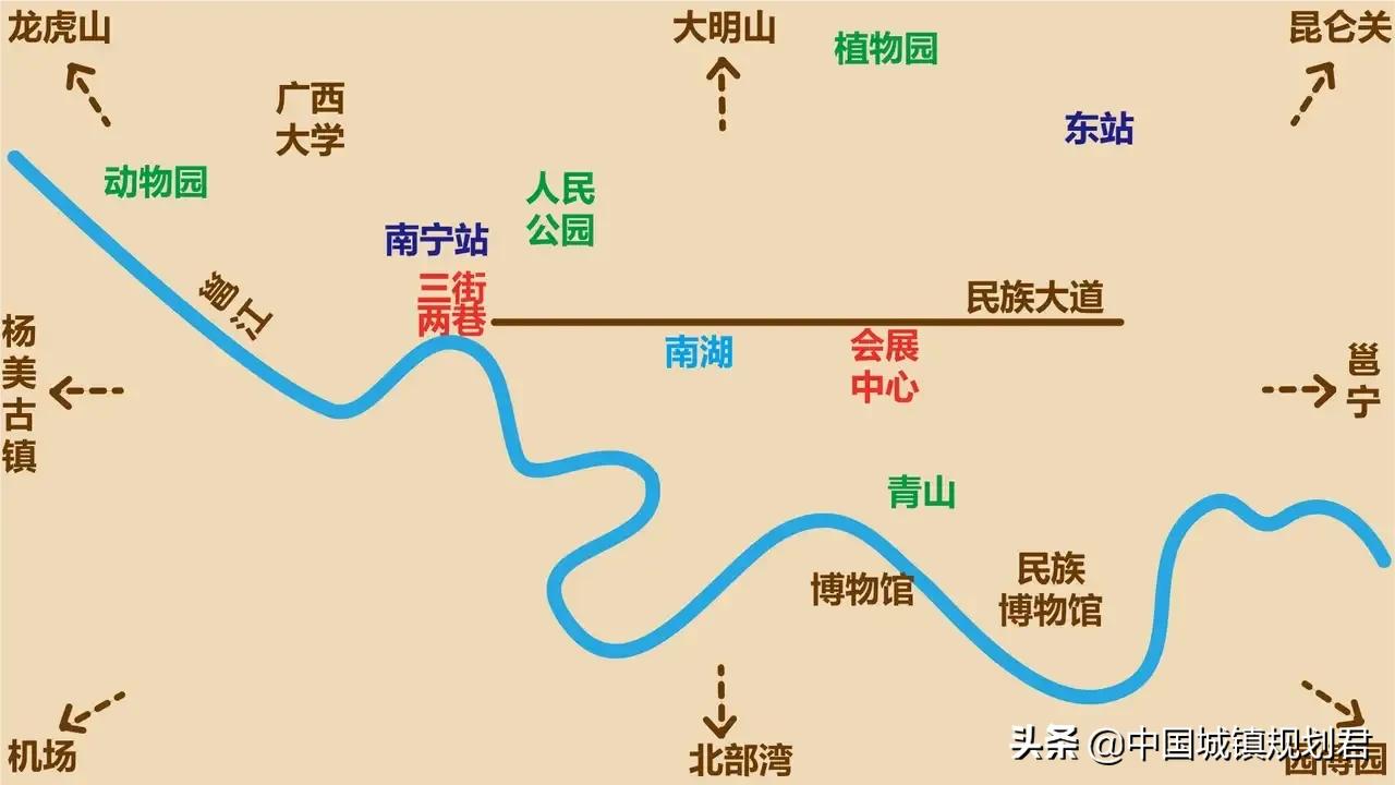 上圖是廣西自治區首府南寧市的極簡地圖,南寧市的標志大道就是東西向的民族大道,加上邕江穿城而過就具有了城市的顯著特征。