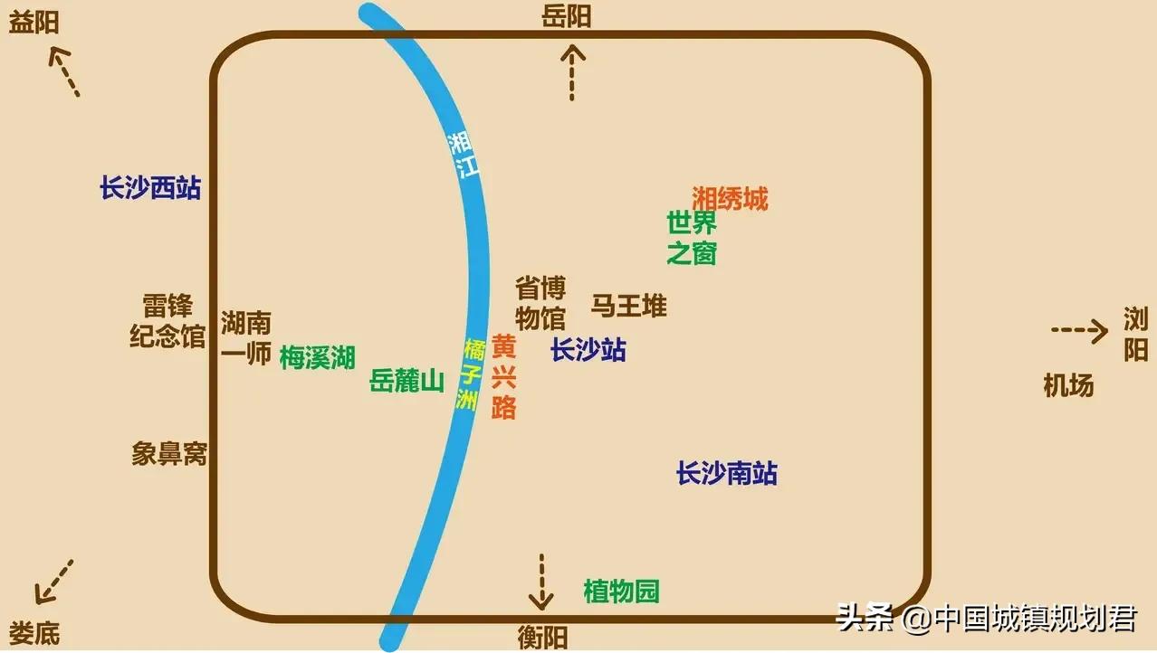 上圖是湖南省會長沙市的極簡地圖,湘江由南向北穿城而過,長沙市的城市布局跟山西省會太原市布局太像了。