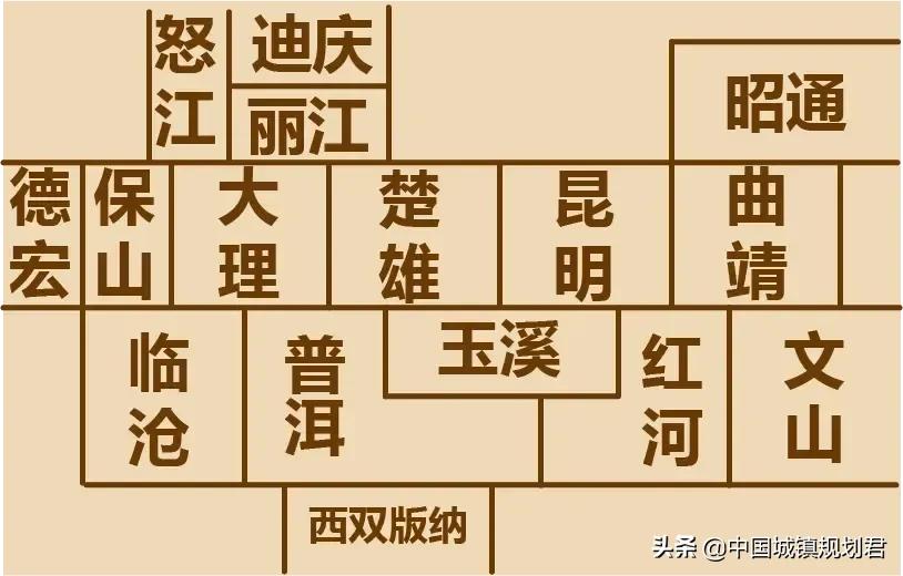 第十張極簡地圖是云南省地圖。從圖上看,云南省的地理幾何中心在楚雄州南部區域。全省的中心在昆明市與玉溪市,而東部中心城市是曲靖市,南部中心在紅河州的個開蒙(個舊市、開遠市、蒙自市),西部中心城市是大理市(大理州大理市)。
