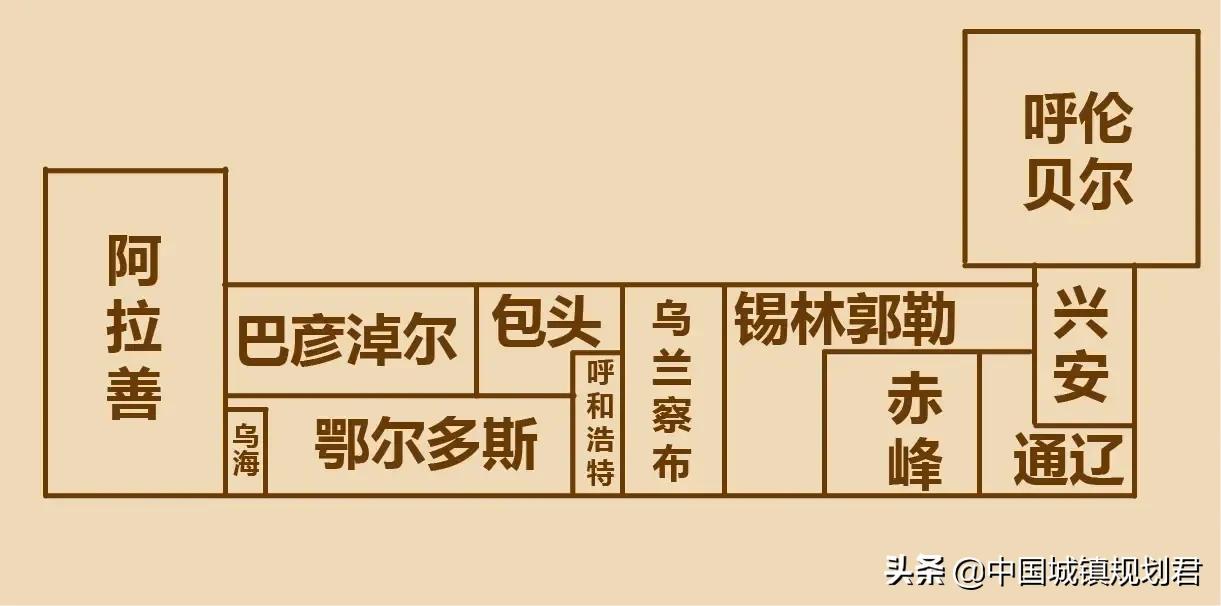 第四張極簡地圖是內蒙古自治區地圖。從極簡地圖上看,內蒙古就像一列小火車,車頭是呼倫貝爾市(指引方向),車尾是阿拉善盟(不拖后腿),火車中心是自治區首府呼和浩特市(掌控大局),火車動力系統是鄂爾多斯市(經濟引擎)。但是地級烏海市實在太小了,完全可以考慮撤銷并入周邊的鄂爾多斯市了。