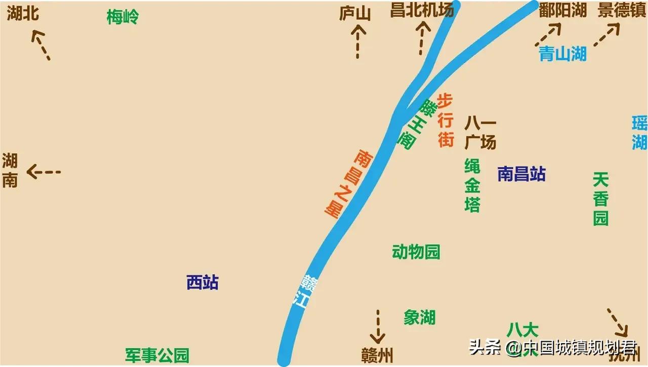 上圖是江西省會南昌市的極簡地圖,南昌市城市最顯著特征就是贛江穿城而過,一切都圍繞贛江布局。