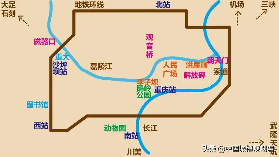 上圖是山城重慶市的極簡地圖,重慶市的兩江(長江和嘉陵江)合流形成的城市格局十分特別。