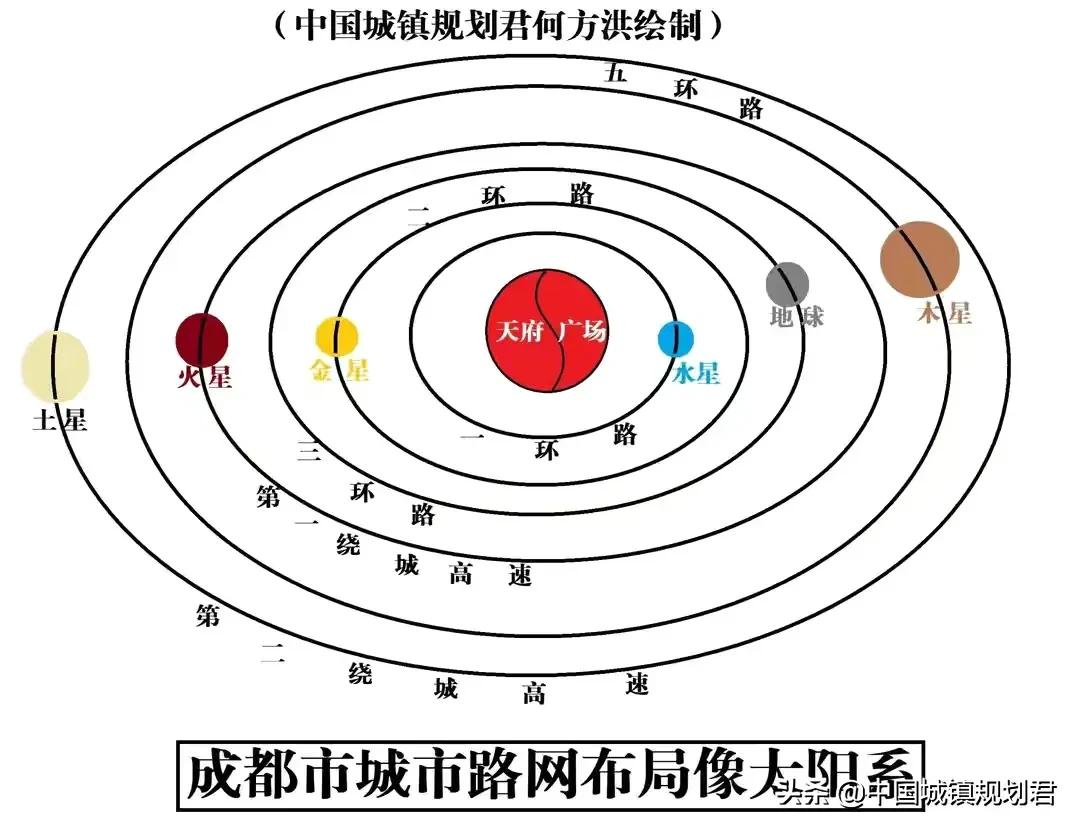 上面這張圖就更形象了,天府廣場就是中心,一環路像水星軌道,二環路像金星軌道,三環路像地球軌道,第一繞城高速公路像火星軌道,木星軌道像四環路,土星軌道像第二繞城高速公路。