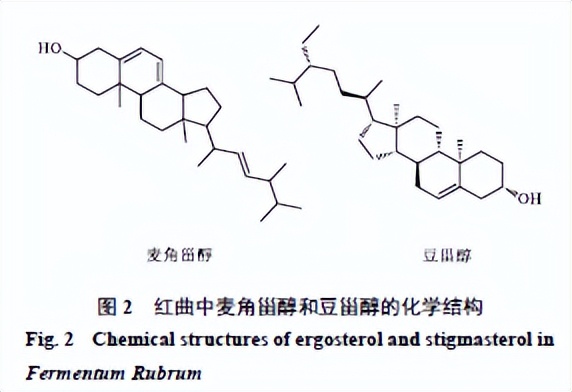葛鋒等[20]研究發現在洛伐他汀同等劑量下,紅曲的調脂效果明顯優于洛伐他汀。由此認為紅曲中還存在其他物質可以調節血脂,并從紅曲中分離得到了調脂活性成分豆甾醇,證明紅曲中的調脂成分并非只有莫納可林類物質。實驗表明,紅曲能有效降低大鼠膽固醇,有一定的調血脂作用[38]。楊俊慧等[39]將紅曲微粉化并填充膠囊,觀察其對頸動脈粥樣硬化患者血清單核細胞趨化蛋白-1(monocytechemotactic protein-1,MCP-1)、基質金屬蛋白酶-9(matrix metalloproteinase-9,MMP-9)水平的影響。結果顯示,紅曲微粉膠囊可減小頸動脈粥樣硬化斑塊,明顯降低頸動脈粥樣硬化患者血清MCP-1、MMP-9水平,起到保護血管內皮的作用。