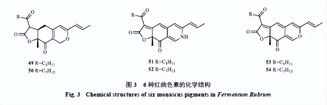 紅曲色素是紅曲霉的次級代謝產物,其本質是聚酮類化合物[26],主要由紅、橙、黃3類色素組成[27]。至今被發現紅曲色素已達54種,紅曲色素的研究主要集中在6種成分,即黃色的紅曲素(49)和安卡紅曲黃素(50)、紅色的紅斑紅曲胺(51)和紅曲玉紅胺(52)、橙色的紅斑紅曲素(53)和紅曲玉紅素(54),化學結構見圖3。紅色色素占紅曲色素含量的大部分,所以紅曲在視覺上呈現深紅色[28]。近年來黃色素與橙色素的抗腫瘤作用成為研究熱點之一,其對多種惡性腫瘤細胞均具有抑制作用[26]。劉燕玲等[29]實驗證明紅曲黃色素對高脂血癥小鼠具有顯著的肝臟保護作用,并能有效調節血脂,作用機制可能與脂代謝調節和激活腺苷酸活化蛋白激酶途徑刺激脂肪酸氧化有關。