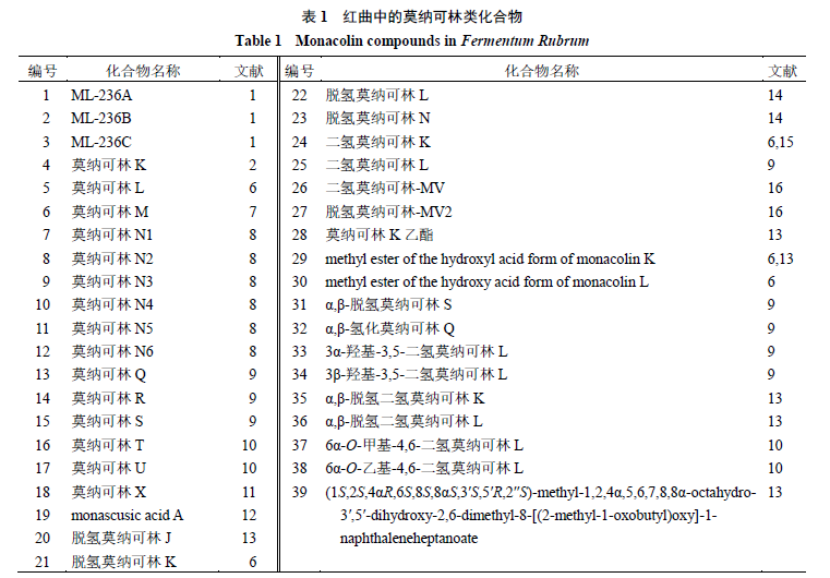近年來,隨著研究的不斷深入,人們發現紅曲中還有更多莫納可林類化合物。目前,共從紅曲中分離得到了39個莫納可林類化合物,見表1和圖1。其中化合物11和12為非對映異構體,其立體結構有待于進一步研究。