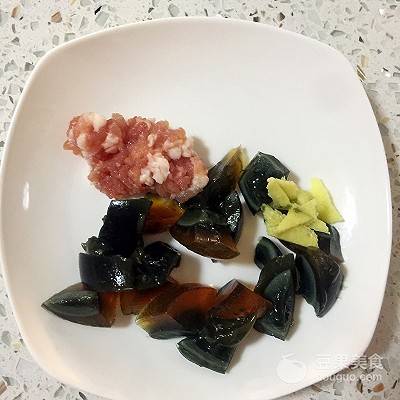 4、將皮蛋切小塊,瘦肉剁成茸。