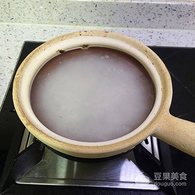 2、砂鍋內加入熱水,將米倒入。