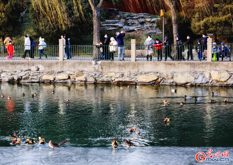 導讀近日,在北京市西城區北海公園內,眾多市民游客駐足觀賞太液池湖面上“群鴨戲水”的景象。每年立春之后,隨著天氣轉暖,太液池的冰面開始消融,鴛鴦、綠頭鴨等水禽泛波嬉戲、游水覓食,春日畫卷