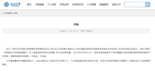 5月24日,就網傳有關海通證券發布與昆明城投有關會議紀要傳言,海通證券最新發布澄清聲明。