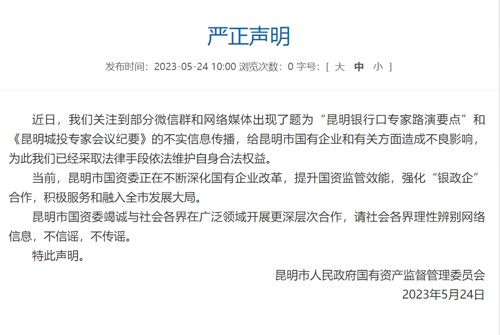5月24日上午,昆明市人民政府國有資產監督管理委員會發布聲明稱,近日部分微信群和網絡媒體出現了題為“昆明銀行口專家路演要點”和《昆明城投專家會議紀要》的不實信息傳播,給昆明市國有企業和有關方面造成不良影響,為此已經采取法律手段依法維護自身合法權益。