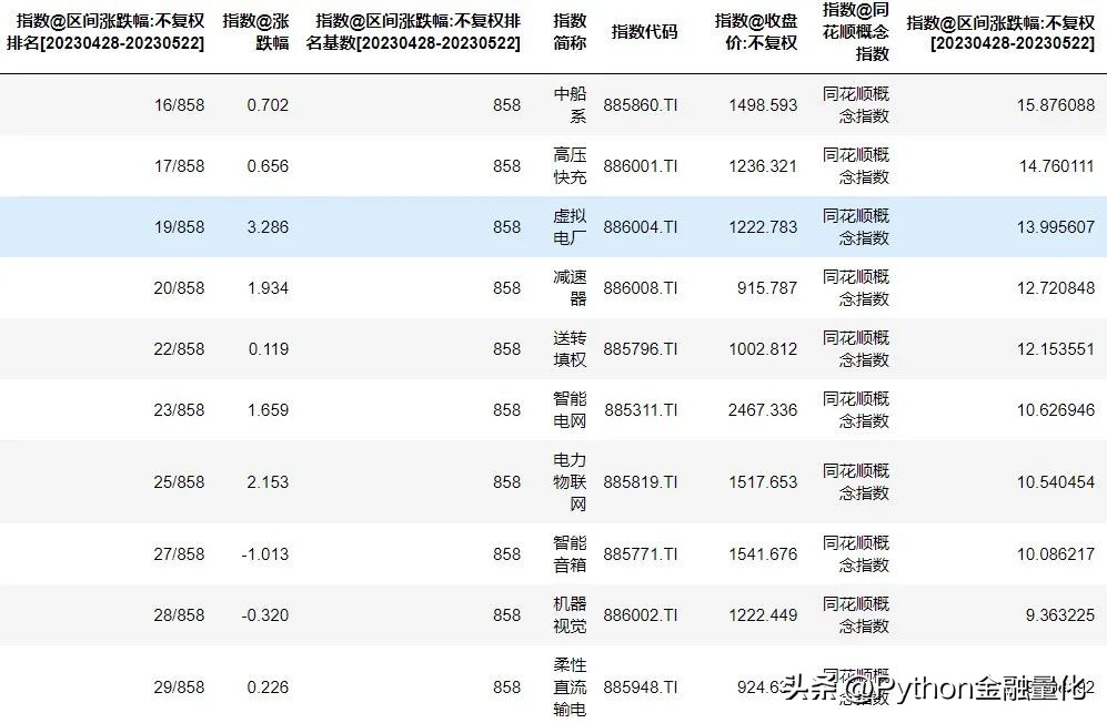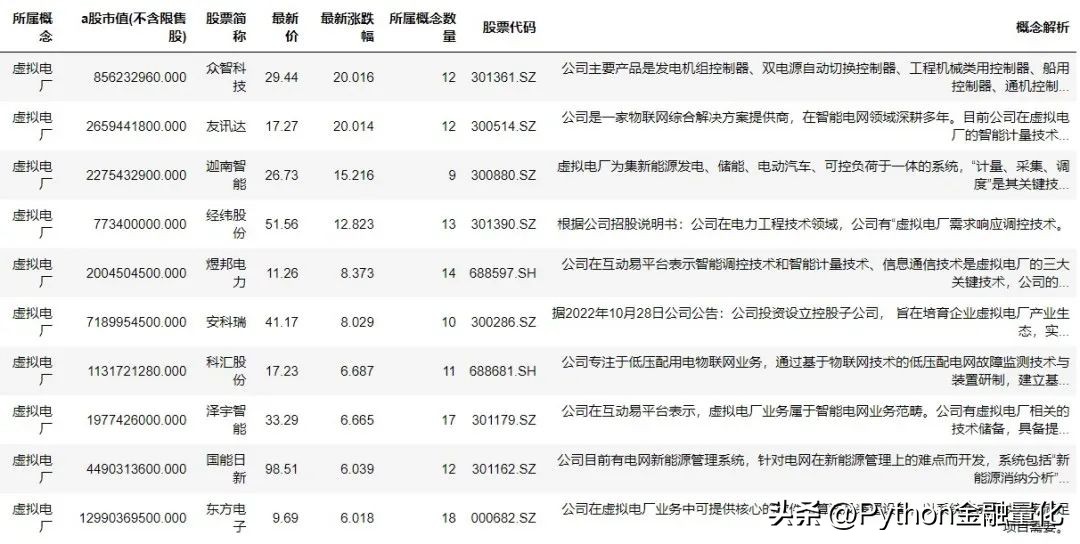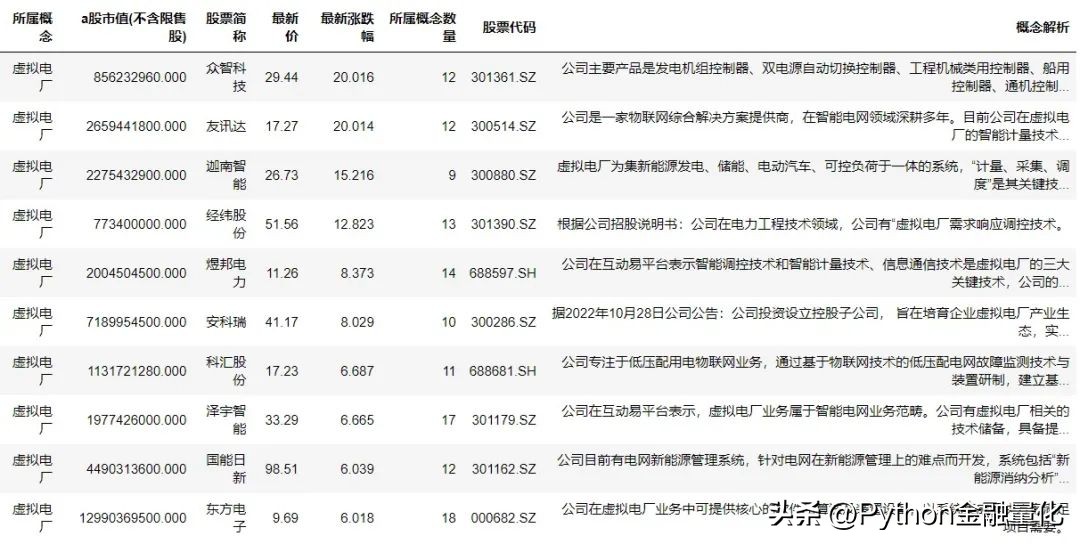 qs.wencai(&39;概念板塊近14日累計漲幅排名前10&39;)df=qs.wencai(&39;虛擬電廠概念股&39;)