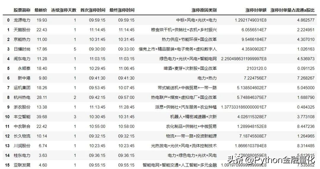 df[[&39;股票簡稱&39;,&39;最新價&39;,&39;連續漲停天數&39;,&39;首次漲停時間&39;,&39;最終漲停時間&39;,&39;漲停原因類別&39;,&39;漲停封單額&39;,&39;漲停封單量占流通a股比&39;]]df=qs.wencai(&39;近5日漲停次數排名前20,非ST,上市時間大于1個月&39;)