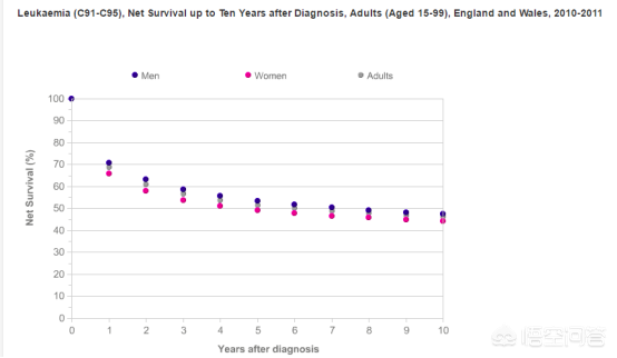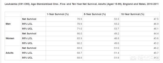 比如,英國癌癥研究機構給出英格蘭和威爾士成年人白血病1、5、10年存活率數據如下: