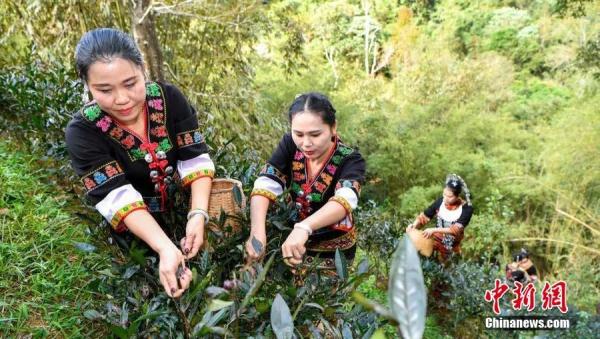身著黎族服飾的黎族姑娘采茶。駱云飛 攝