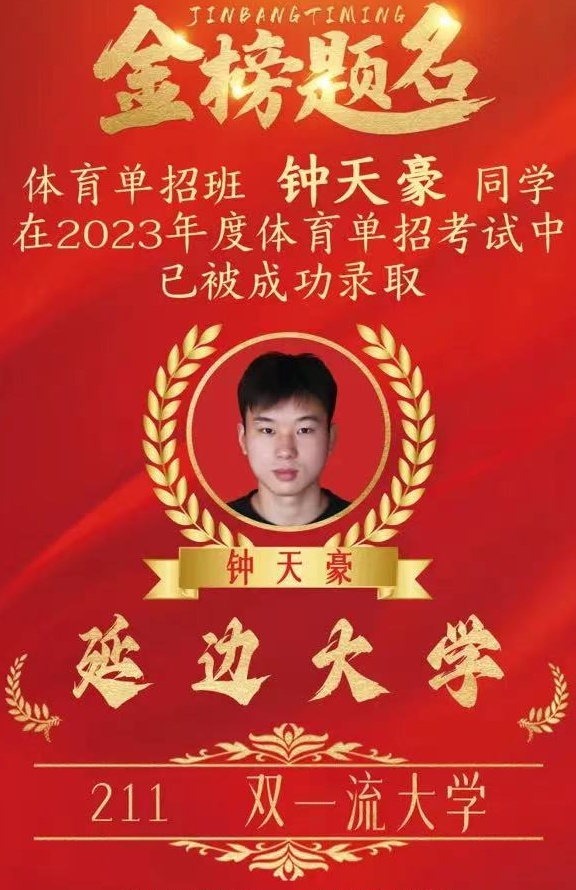 被延邊大學錄取后,鐘天豪表示,非常感謝學校和老師們,沒有他們的耐心教導,自己不能圓“大學夢”。學校給同學們提供了學習和展示的舞臺,只要你敢拼敢搏,為了夢想努力,就可以給自己展示的機會!