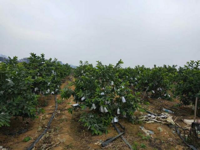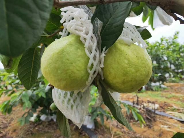 你看,番石榴在樹上的時候就得每個果套上兩層,套上一層網套,還要套上一個袋子。番石榴的表皮很薄,是可以直接吃皮的,手一碰沒幾下就發黑,水分就很容易流失,所以必須摘的時候要防止碰傷,還要袋子保濕,這個果若果打開袋子,沒兩天就變樣了,更別說賣了。