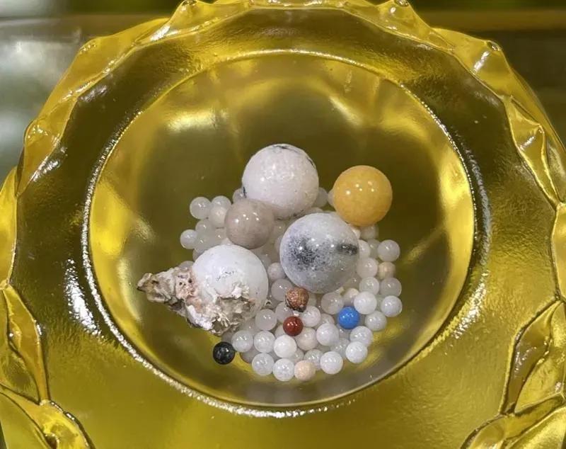 從臺灣媒體曝光的圖片上看,舍利子外形比較圓潤,表面泛著光芒:有的舍利子為黑色,有的為黃色,有的為紅色,有的為白色,甚至有的由多種顏色混合而成。
