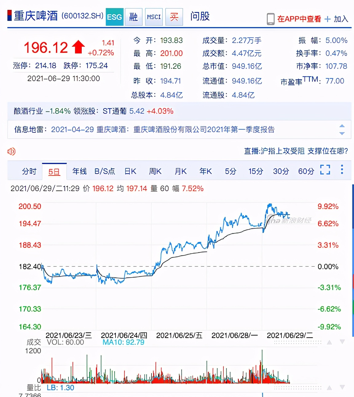截至發稿,重慶啤酒漲幅回落至1%以內報196.12元/股,總市值949.16億元。