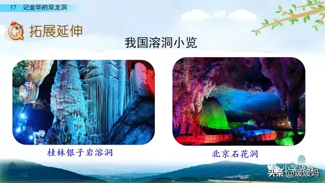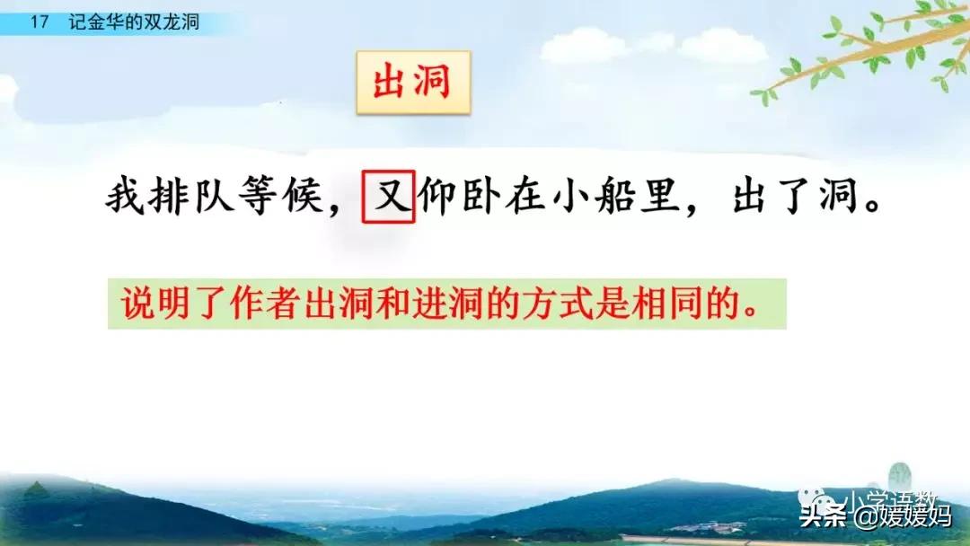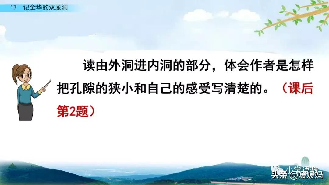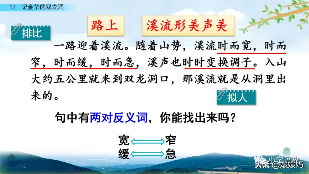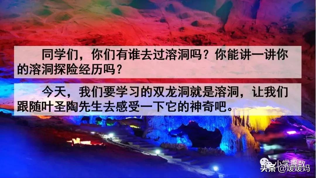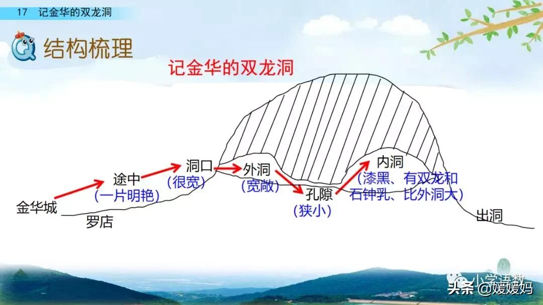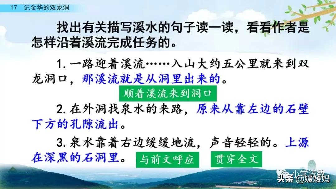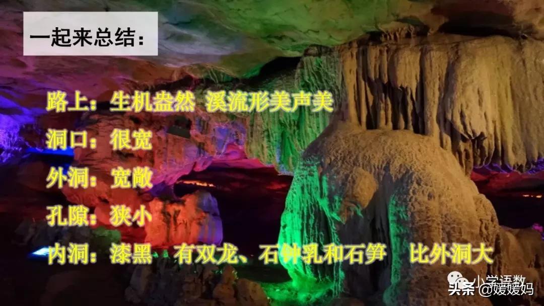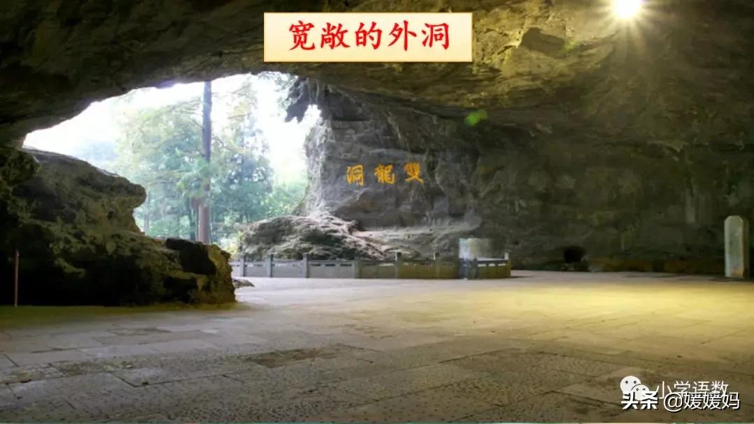 一個“迎”字,點明作者是逆溪流而上。“時而……時而……”運用排比句式,說明了溪流蜿蜒曲折,由于溪流的寬窄不一,才形成流水速度的緩急不同,作者巧妙地運用“寬、窄;緩、急”兩對反義詞準確地表達溪流的形和聲。由于溪流緩急不一,聽到的流水聲也就各不相同,猶如在“時時變換調子”。這句話烘托了作者當時的游興有多濃,對涓涓溪流發出如此贊嘆!第一句話說明了雙龍洞周圍的地勢環境,使讀者有身臨其境之感。第二句話則點明了雙龍洞的準確位置,同時也為作者開始參觀雙龍洞起了過渡作用。