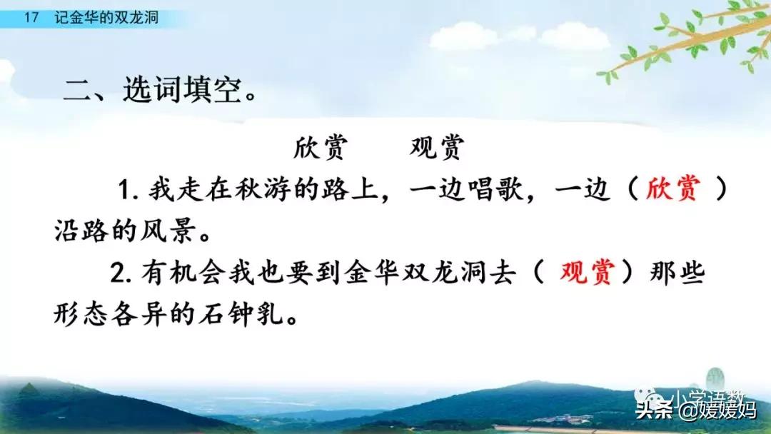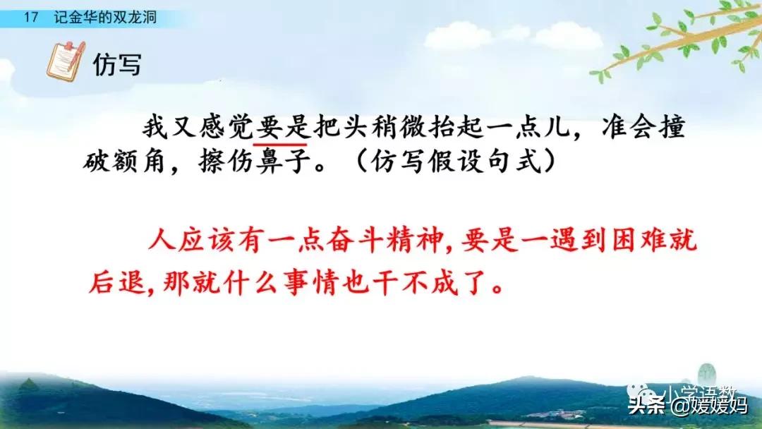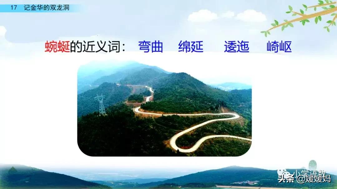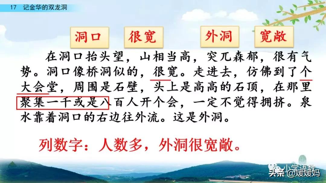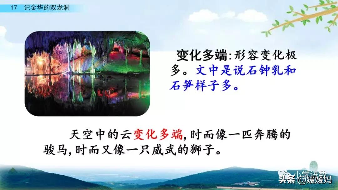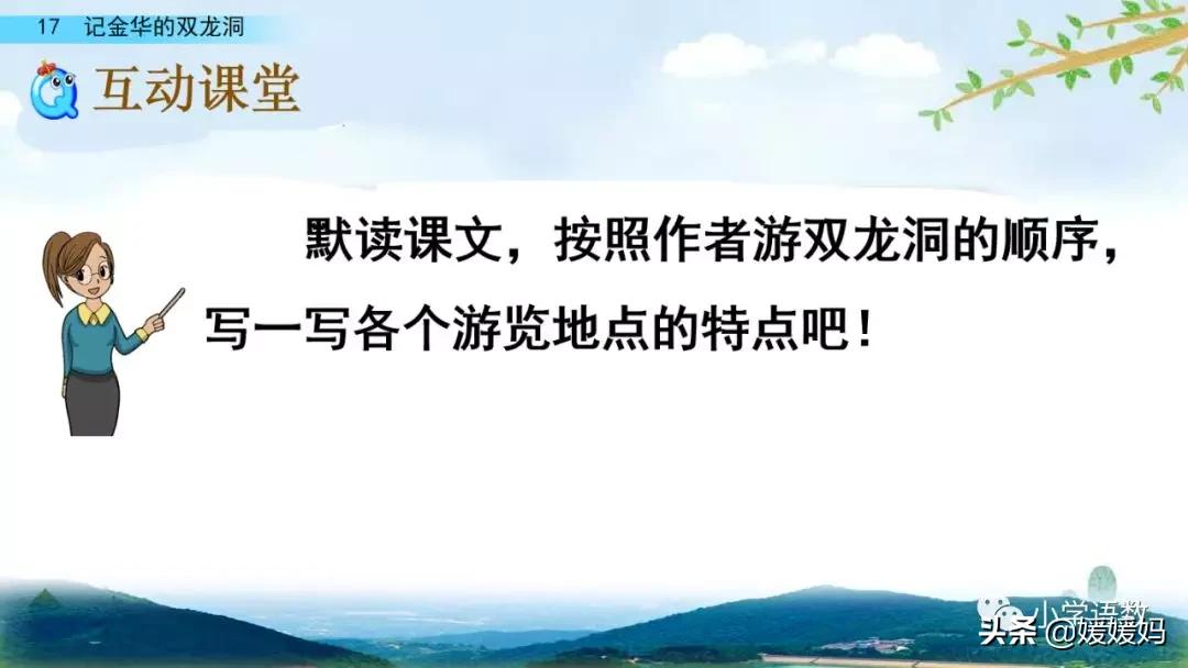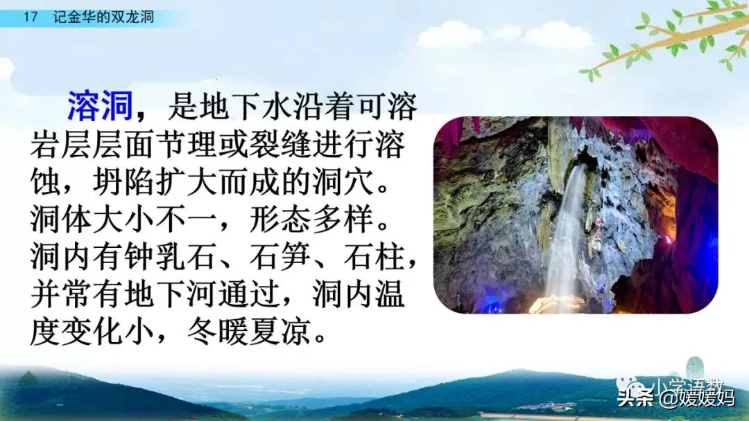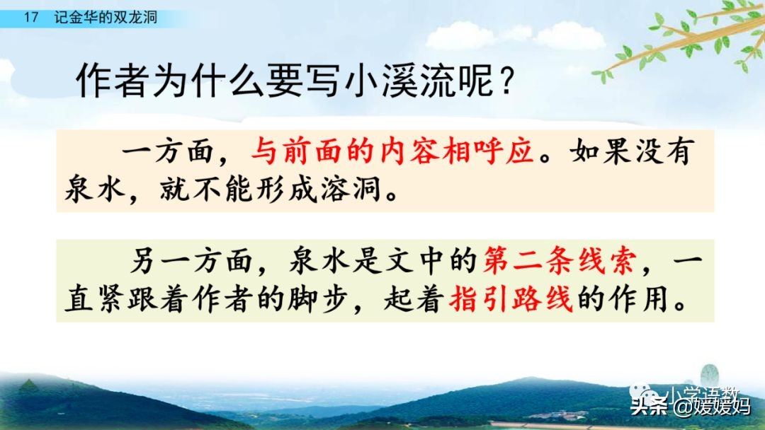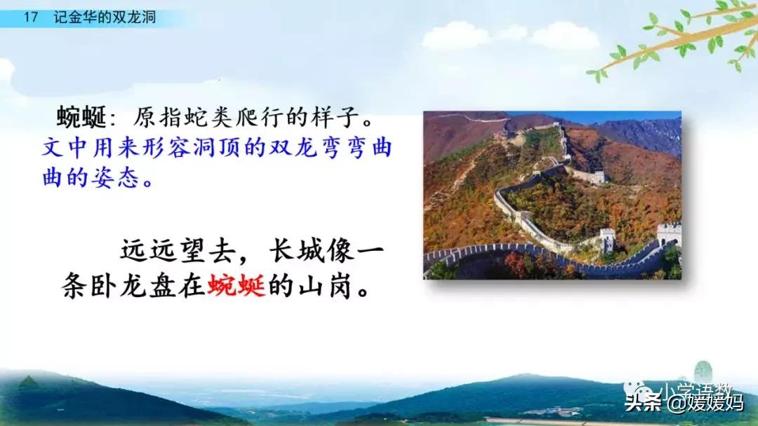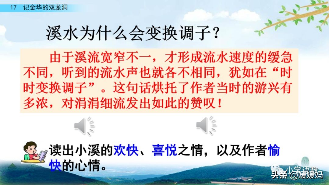 一個“迎”字,點明作者是逆溪流而上。“時而……時而……”運用排比句式,說明了溪流蜿蜒曲折,由于溪流的寬窄不一,才形成流水速度的緩急不同,作者巧妙地運用“寬、窄;緩、急”兩對反義詞準確地表達溪流的形和聲。由于溪流緩急不一,聽到的流水聲也就各不相同,猶如在“時時變換調子”。這句話烘托了作者當時的游興有多濃,對涓涓溪流發出如此贊嘆!第一句話說明了雙龍洞周圍的地勢環境,使讀者有身臨其境之感。第二句話則點明了雙龍洞的準確位置,同時也為作者開始參觀雙龍洞起了過渡作用。