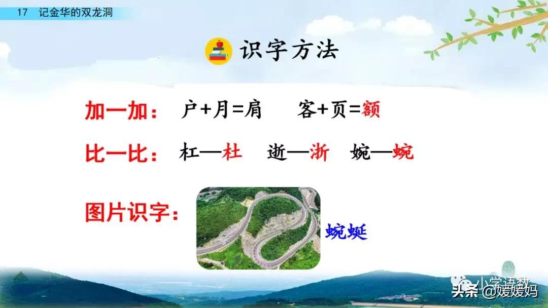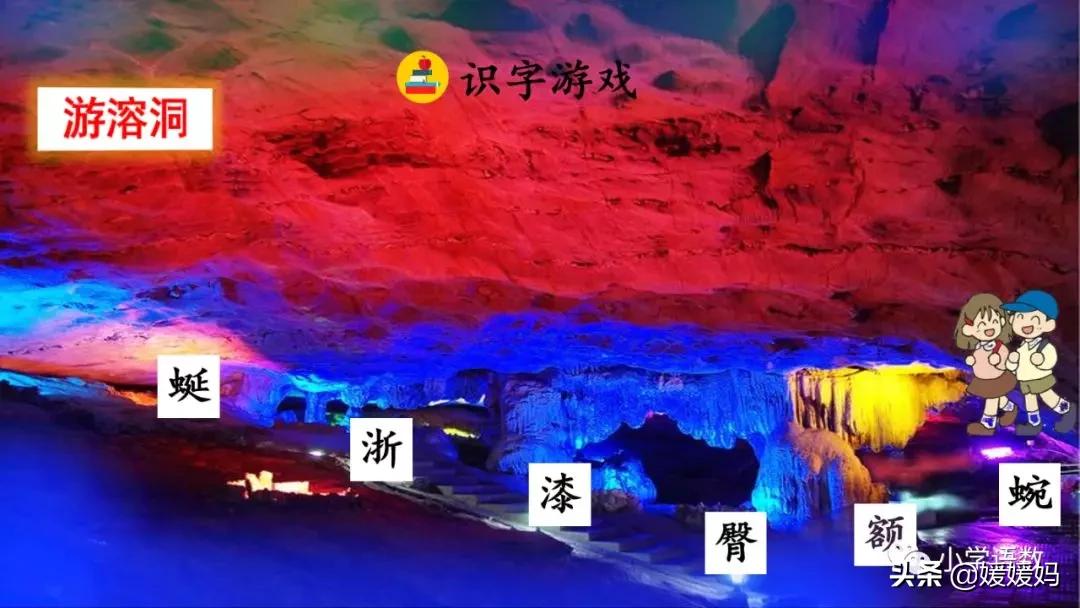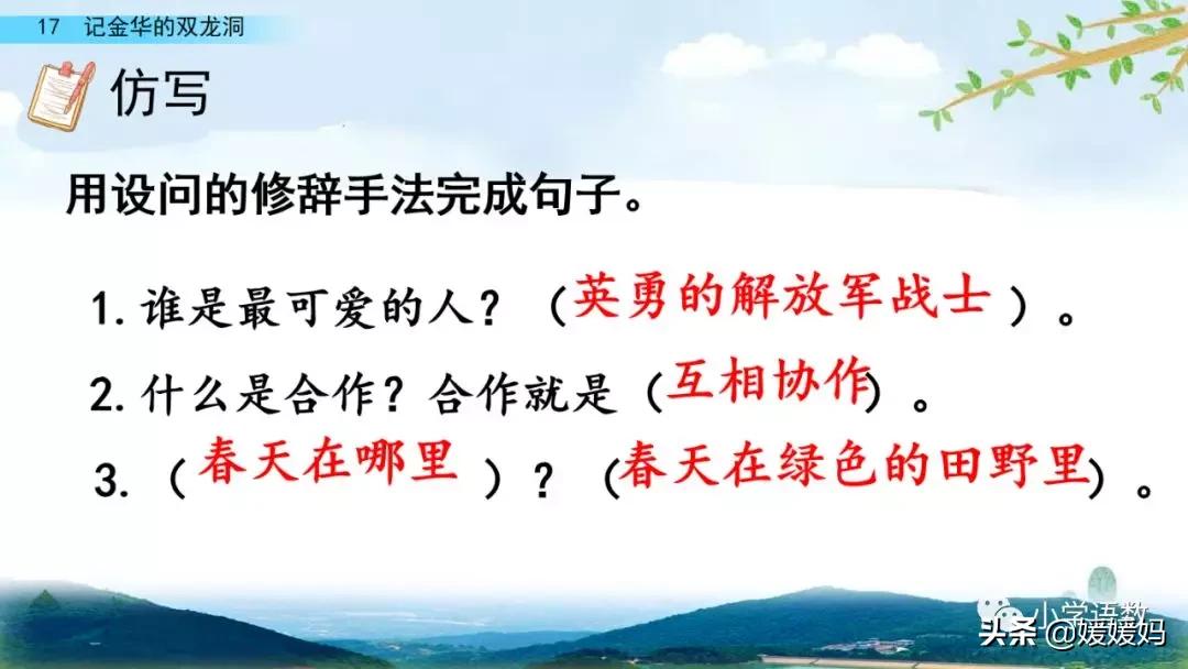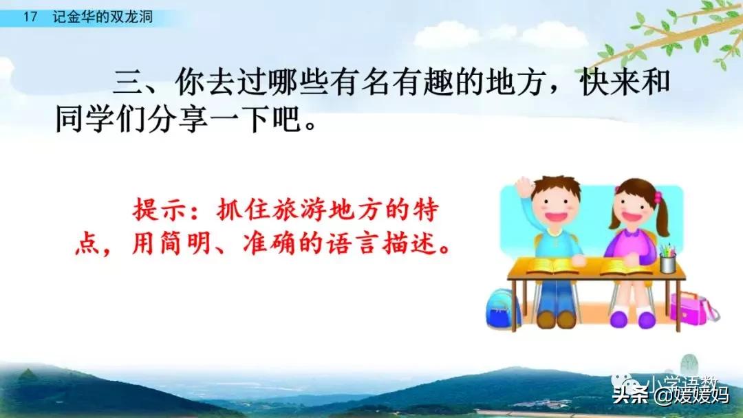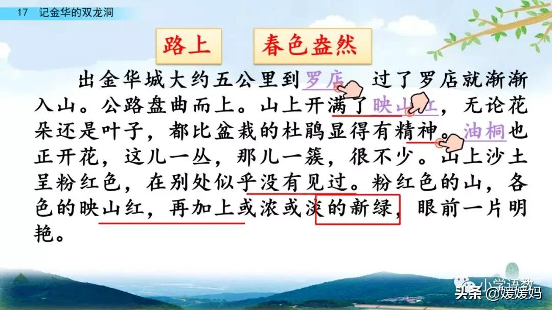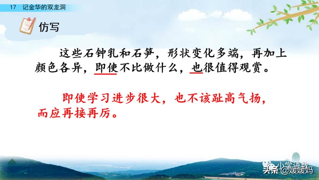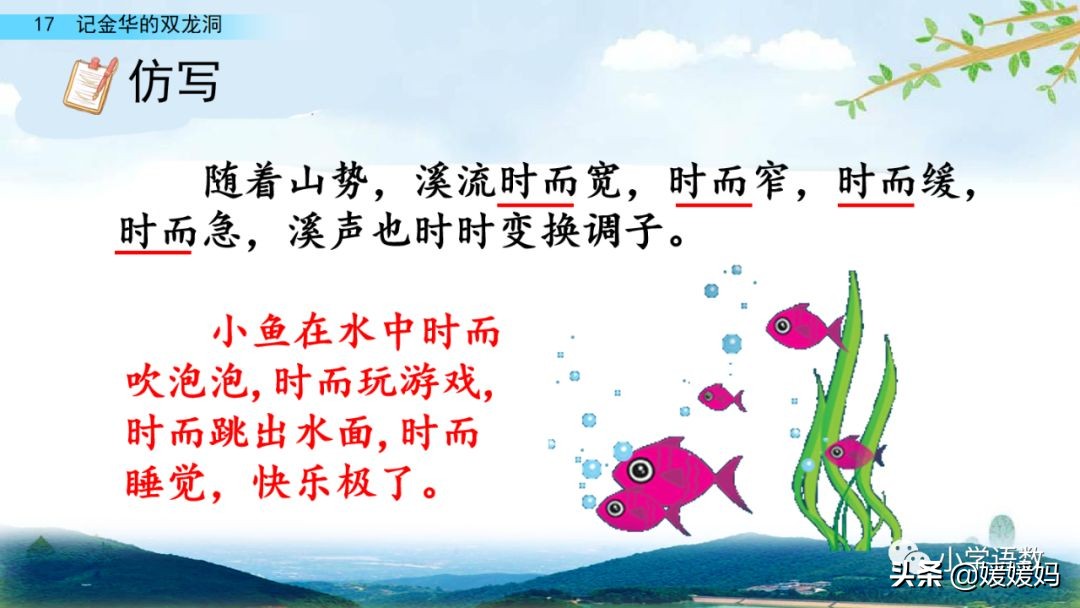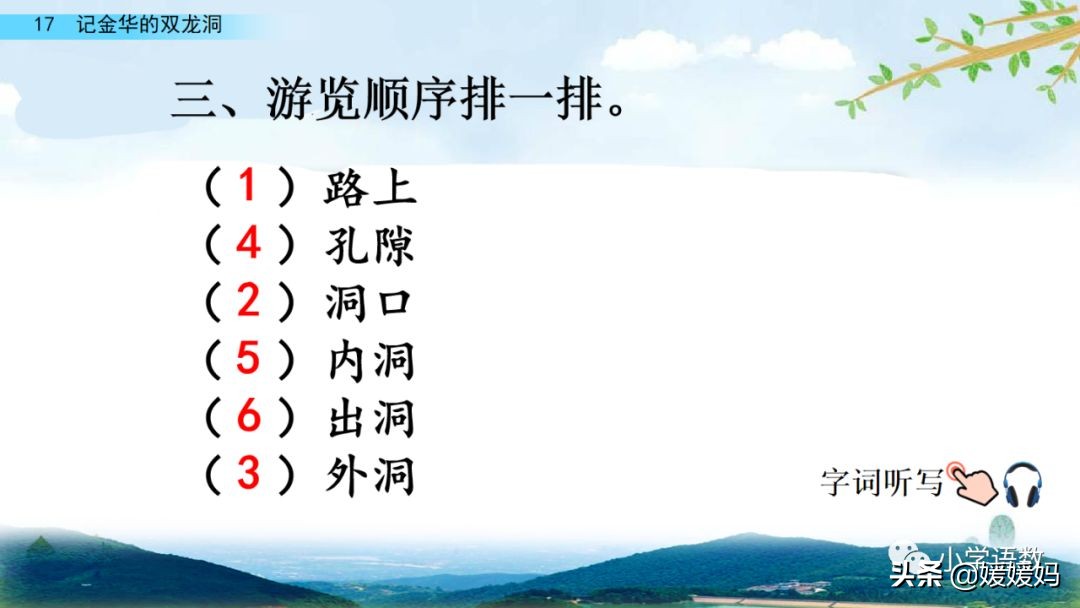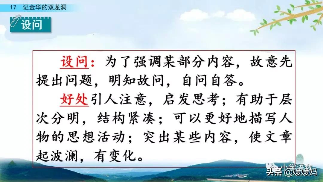一個“迎”字,點明作者是逆溪流而上。“時而……時而……”運用排比句式,說明了溪流蜿蜒曲折,由于溪流的寬窄不一,才形成流水速度的緩急不同,作者巧妙地運用“寬、窄;緩、急”兩對反義詞準確地表達溪流的形和聲。由于溪流緩急不一,聽到的流水聲也就各不相同,猶如在“時時變換調子”。這句話烘托了作者當時的游興有多濃,對涓涓溪流發出如此贊嘆!第一句話說明了雙龍洞周圍的地勢環境,使讀者有身臨其境之感。第二句話則點明了雙龍洞的準確位置,同時也為作者開始參觀雙龍洞起了過渡作用。