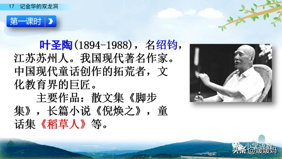 葉圣陶(18941988) 原名葉紹鈞,字秉臣,江蘇蘇州人,我國現代著名作家、教育家、文學出版家和社會活動家,有“優秀的語言藝術家”之稱,是現代童話創作的重要奠基人。代表作有童話集《稻草人》,長篇小說《倪煥之》。