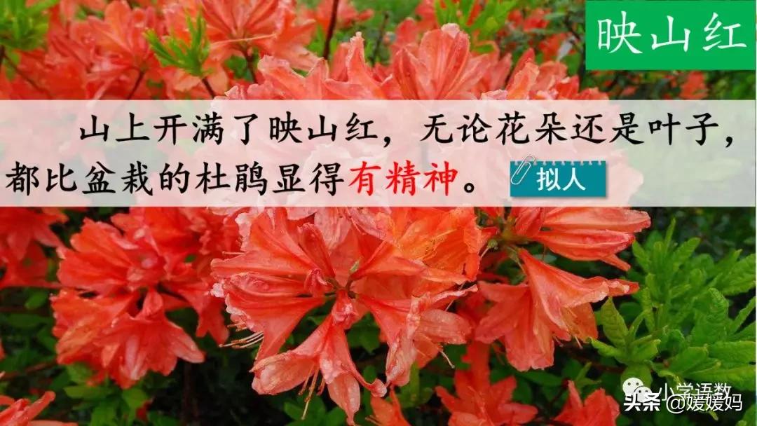 “有精神”本來是形容人的,這里借用,形容花的長勢好。這是一個比較句,拿滿山開遍的映山紅和盆栽的杜鵑花相比,比的結果是山上的映山紅“有精神”,突出了山上景色的美麗。山上的映山紅根深葉茂,沐浴著大自然的陽光雨露,植株高大,花朵大而繁多。盆栽的人工培育嬌嫩而不茁壯,比起山上的映山紅就顯得遜色了。