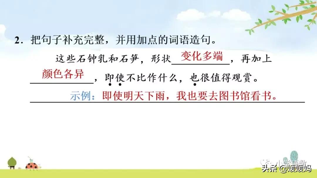 這句話的意思是說石鐘乳和石筍是非常值得觀賞的,原因是形狀變化多端,顏色又各異。“端”,項目。“變化多端”,就是變化多種多樣。“異”,不同。“顏色各異”,就是顏色各不相同。“即使”,就算是,表示一種假設。用“即使”這個關聯詞作強調,即退一步講,如果不把這些石鐘乳、石筍具體比做什么也值得觀賞,說明內洞的石鐘乳和石筍本身就絢麗多姿,奇特好看,本身已經夠吸引人了,無需再比作什么了。