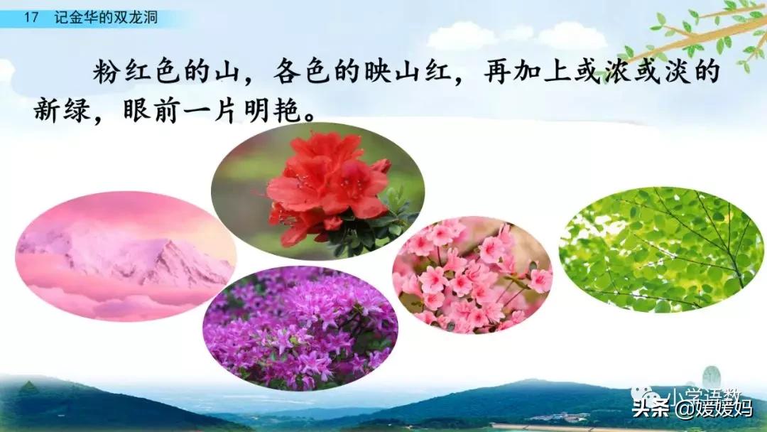 (突兀森郁)的山 (各色)的映山紅 (或濃或淡)的綠