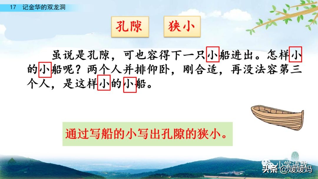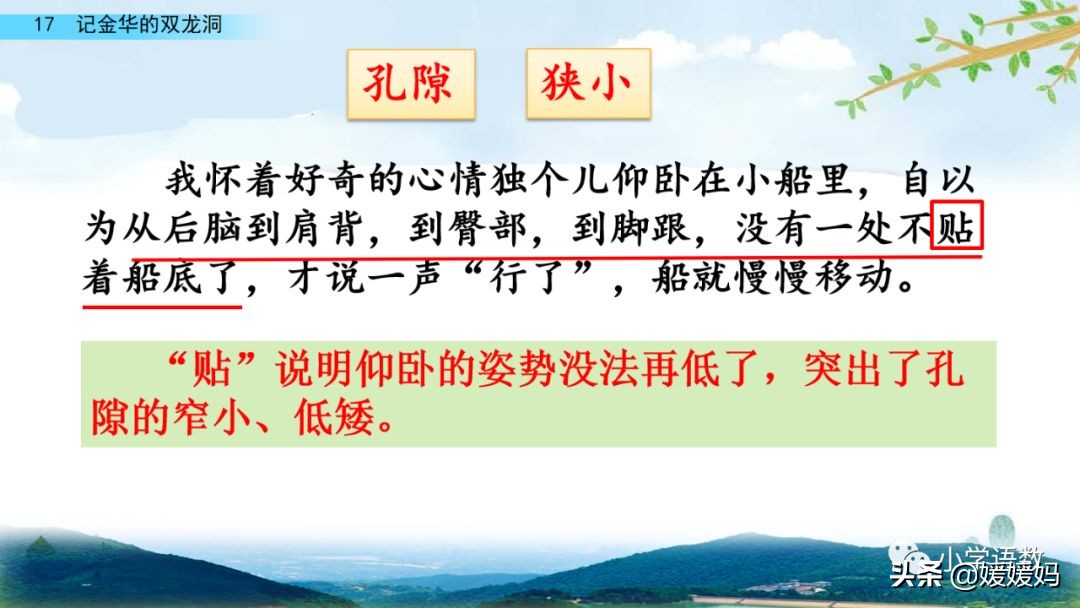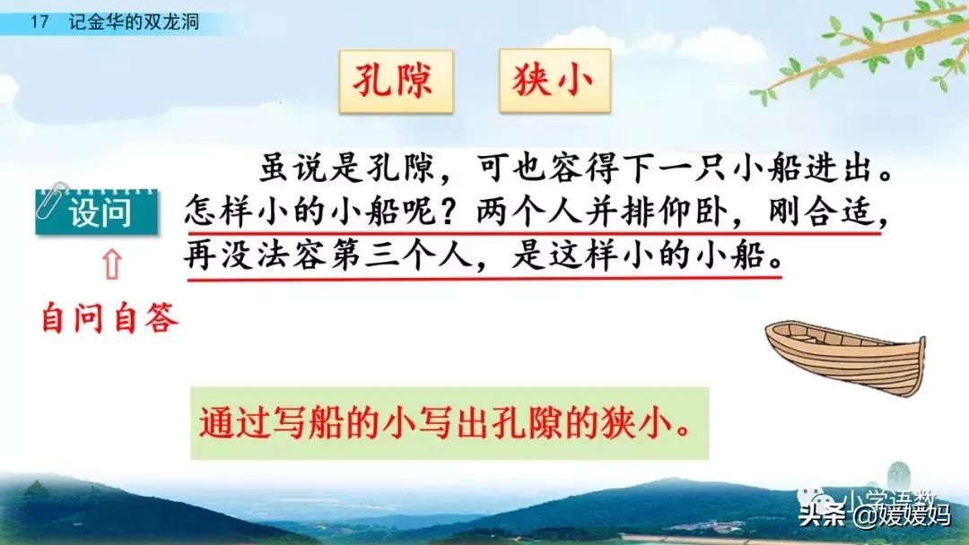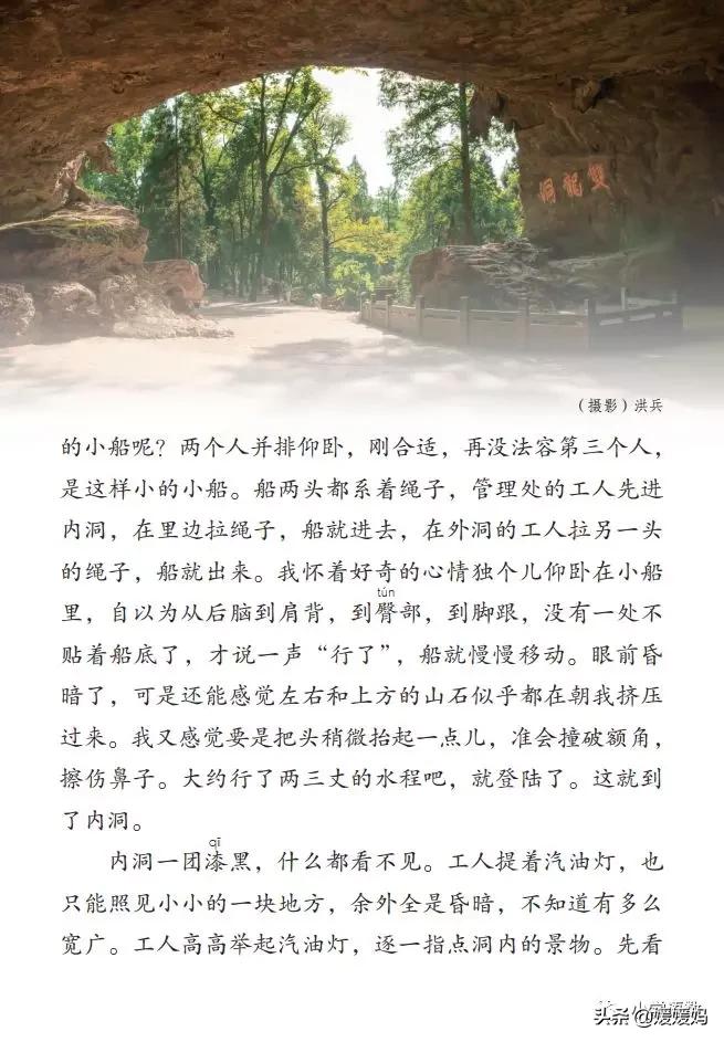 作者寫孔隙的狹小,是通過寫小船的大小(只能容得下兩個人并排仰臥)和小船的進出方式(船兩頭系繩子,靠內外洞的工人拉動)寫清楚的;寫作者自己的感受,是通過寫作者實際的體驗過程(仰臥在小船里的狀態和船移動時的感覺)寫清楚的。運用“要是……準會……”的表示假設關系的句子,準確地表達出作者當時受“擠壓”的感覺。