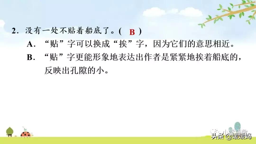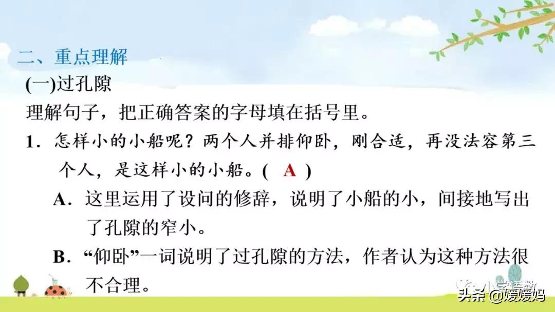 這句話寫出作者通過孔隙時的真實感受,“稍微”“一點兒”告訴我們只有一動不動地平躺在小船上,才能通過孔隙,以此說明孔隙小的特點,非常逼真。運用“要是……準”的假設句式,準確地表達了作者當時受“擠壓”的感覺。