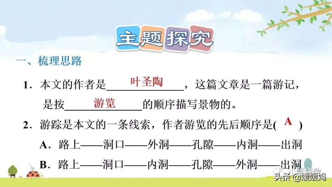 本文是葉圣陶先生早年寫的一篇游記。作者按游覽的先后順序,先寫了去雙龍洞途中的風光,接著寫雙龍洞洞口和來到外洞;再寫怎樣通過孔隙來到內洞;最后寫出洞。游覽路線是:沿途——洞口——外洞——孔隙——內洞——出洞。本文有兩條線索,一是作者的游覽順序,是“順”的線索;二是以水(溪流)為線索,是“逆”的線索。作者多次寫到水。在途中是“一路迎著溪流”,來到洞口時,發現“那溪流就是從洞里流出來的”;“在外洞找泉水的來路,原來從靠左邊的石壁下方的孔隙流出”;在內洞,作者看到了“泉水靠著右邊緩緩地流”,聽到“聲音輕輕的”。以上兩條線索十分清晰。