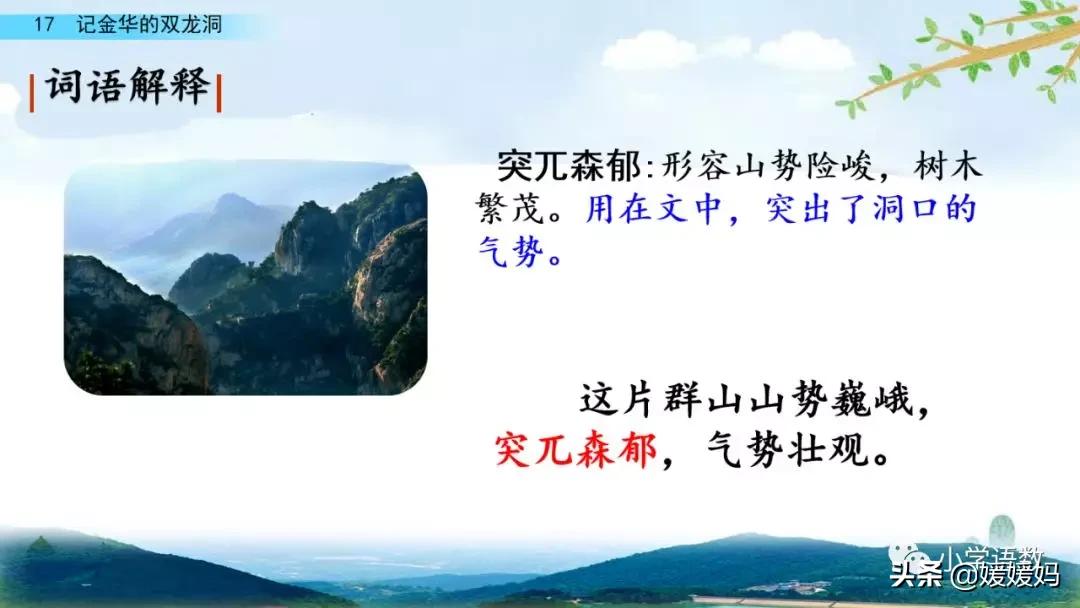 2.在洞口抬頭望,山相當高,(突兀)森郁,很有氣勢。
