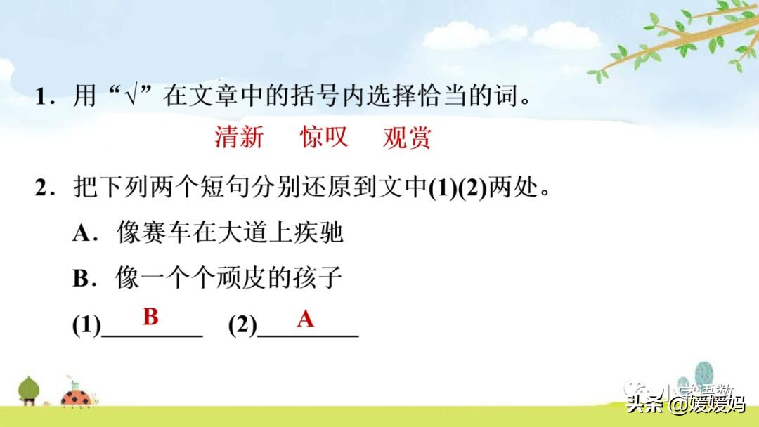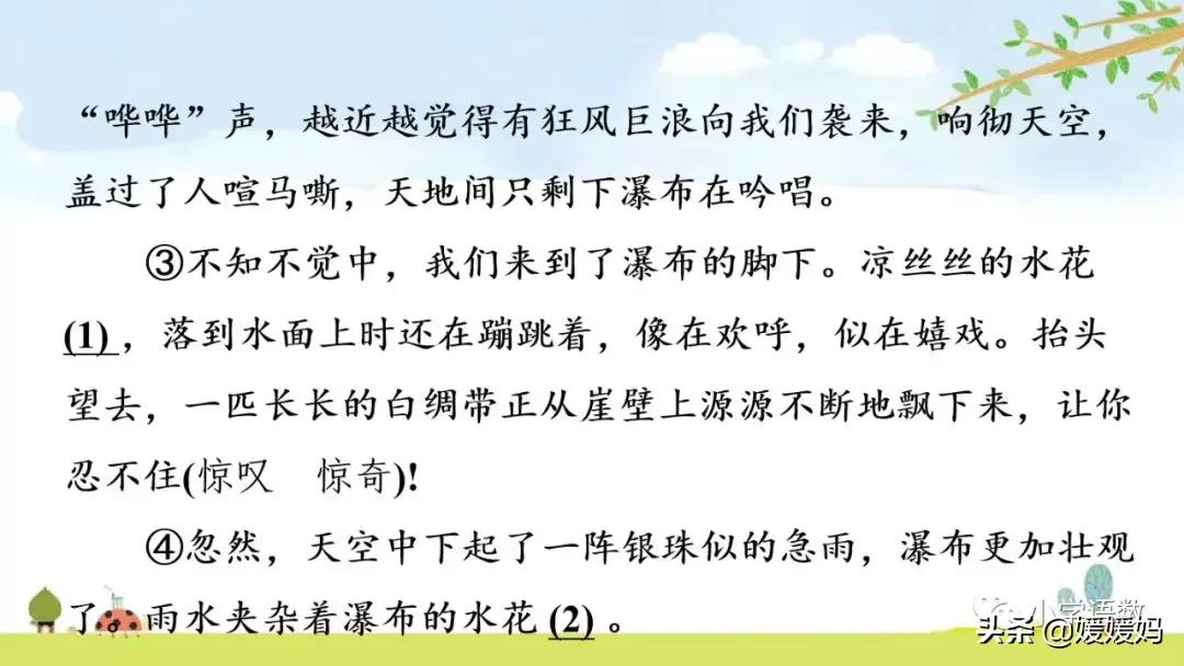 3.她的頭發(烏黑)油亮,好像黑色的瀑布一樣瀉下來。