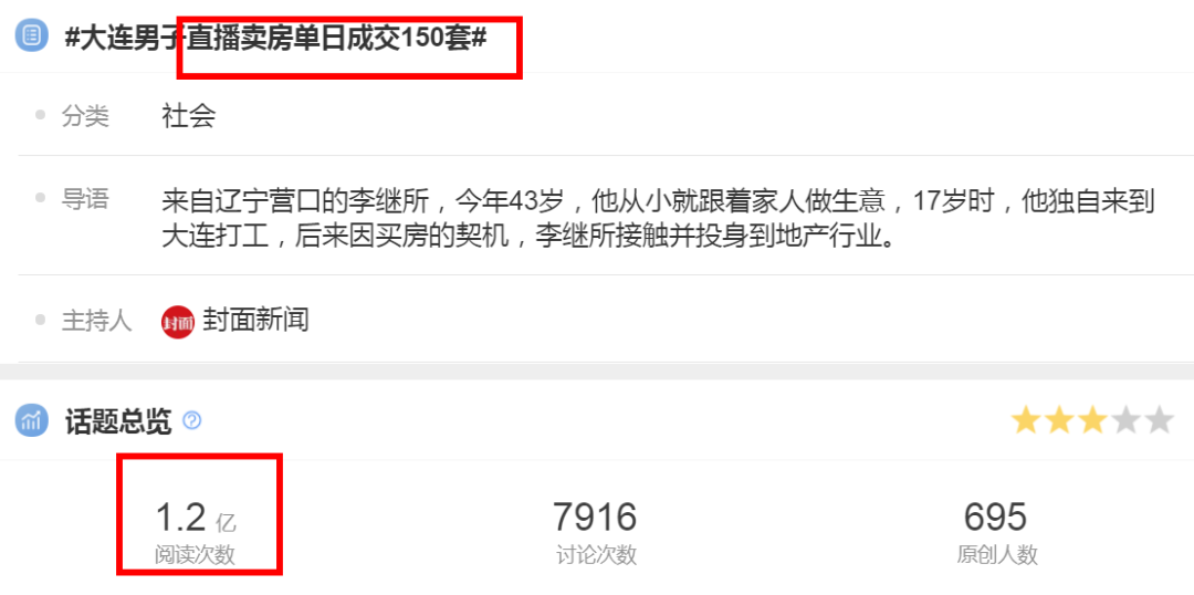 去年12月,一則大連男子直播賣房單日成交150套的新聞登上微博熱搜,根據后續報道,這名主播依靠短視頻平臺直播帶來的銷售線索,單日最高成交額達1.5億。