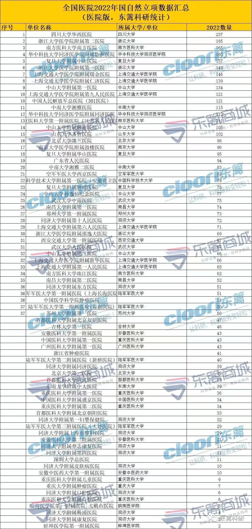 國自然放榜如期而至,在各單位科管老師的大力支持下,現將國家自然科學基金醫學部一些已出評審結果的單位數據進行了初步統計。截至發文前,收集的數據中獲得立項數達到50項及以上的醫院有43家。