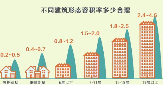 獨立別墅為0.2~0.5;、聯排別墅為0.4~0.7;6層以下多層住宅為0.8~1.2;11層小高層住宅為1.5~2.0;18層高層住宅為1.8~2.5;19層以上住宅為2.4~4.5;住宅小區容積率小于1.0的,為非普通住宅。