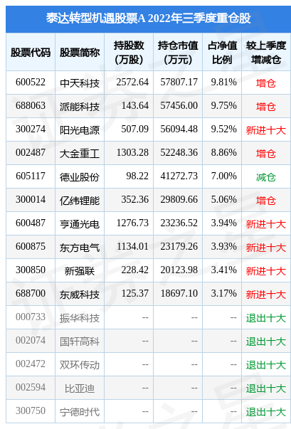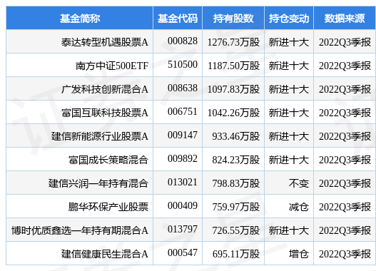 根據2022Q3季報公募基金重倉股數據,重倉該股的公募基金共244家,其中持有數量最多的公募基金為泰達轉型機遇股票A。泰達轉型機遇股票A目前規模為50.23億元,最新凈值2.383(12月23日),較上一交易日下跌2.26%,近一年下跌32.4%。該公募基金現任基金經理為王鵬。王鵬在任的基金產品包括:泰達高研發6個月持有混合A,管理時間為2020年12月28日至今,期間收益率為10.95%;泰達宏利成長混合,管理時間為2020年12月28日至今,期間收益率為6.39%;泰達宏利新興景氣龍頭混合A,管理時間為2021年10月25日至今,期間收益率為-36.42%。