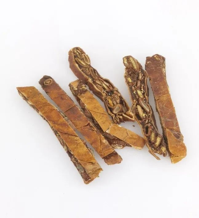 瓜蔞皮:邊緣向內卷曲,外表面橙紅色或橙黃色,皺縮,有的有殘存果梗;內表面黃白色。質較脆,易折斷。具焦糖氣,味淡、微酸。