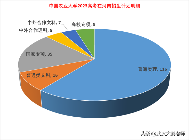 中國農大2023年在河南普通類理科116人、文科16人;中外合作理科8人、文科7人;國家專項35人均為理科、高校專項9人均為理科。