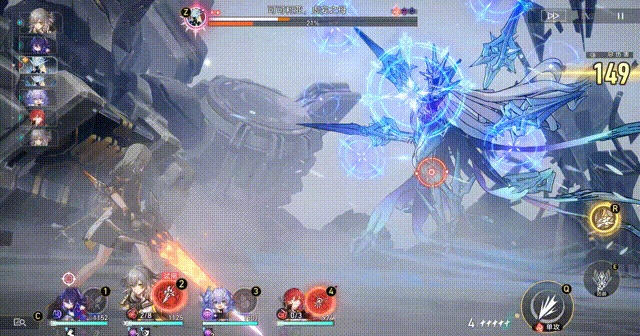 “弱點擊破”除了能夠為敵人造成一段不菲的傷害外,更重要的是會延后其行動順序(《星穹鐵道》采用了回合制游戲常見的速度條設計)。并且,不同元素屬性所造成的“弱點擊破”會產生截然不同的效果。例如冰凍會施加凍結狀態,使敵人無法行動。而火屬性可以讓敵人進入灼燒狀態,造成持續傷害。